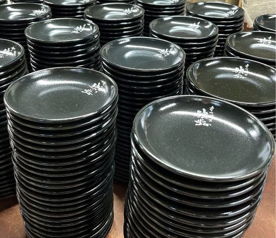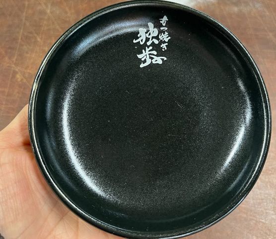 黒色の丸皿に、お店のお名前をお入れしました。